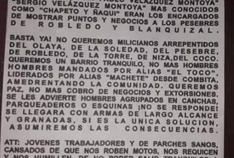 Las autoridades de Medellín indagan la procedencia de un panfleto que circula en algunos negocios de las comunas doce y trece, al parecer, a manos de la banda delincuencial “La Agonía”.