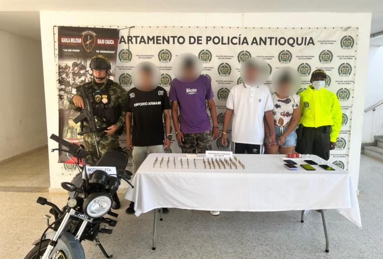 A los capturados se les incautaron 80 cartuchos de munición calibre 38 mm, 5 celulares y una motocicleta. Los tres hombres y la mujer fueron presentados ante las autoridades competentes para los respectivos procesos judiciales; la menor quedó a disposición de la Policía de Infancia y Adolescencia del municipio de Caucasia.